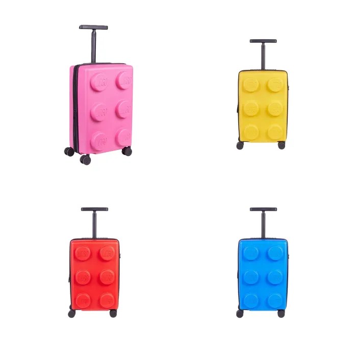 Mala de cabine LEGO, feita em propileno com design icónico LEGO: um lado com bloco LEGO colorido e do outro o logo também em relevo.